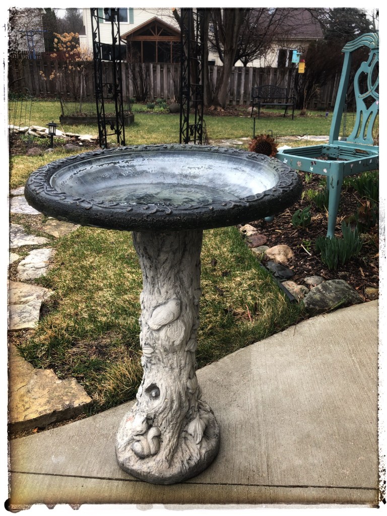 Several decades ago my parents gifted us with a really cool birdbath. I just love all of the little details on the base. The birdbath is made of concrete and is a heavy bugger; even so, it made the move with us when we moved from Milwaukee to our current Fitchburg home twenty-one summers ago. For several years the ornate birdbath graced our secret garden (a little garden outside of our front door that is difficult to see from the street). Sadly, the “bath” part of of it cracked and sprung some leaks a few years ago. Much to our favorite robin’s dismay, I turned the leaky bowl into a succulent garden. [Note: we purchased a new birdbath to replace it, but said robin kept visiting the old one and fussing about the lack of water. He eventually settled in and began enjoying the replacement bath.] Well, the concrete bowl eventually succumbed to the elements, unceremoniously dumping the succulent contents on the ground, and we were left with the ornate concrete base. We tried to put a new bowl on top, but it never fit right. A good, stiff wind would blow it off the base, water and all.