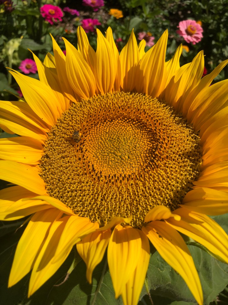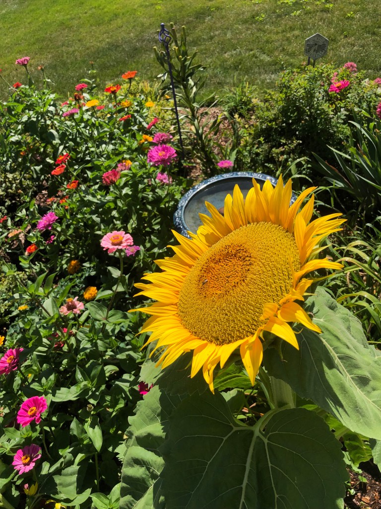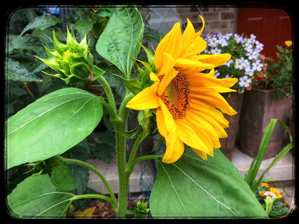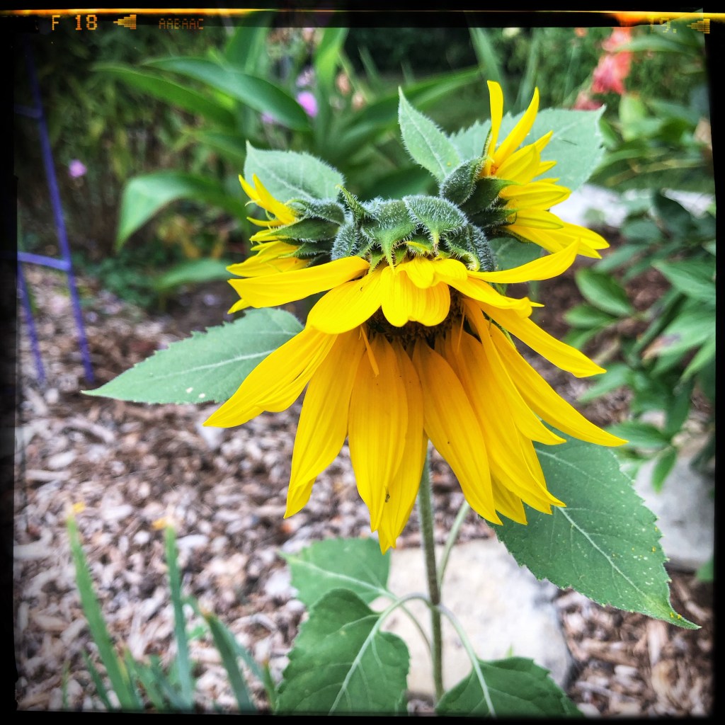 Every year I find sunflowers growing in my garden in places where I wouldn’t have chosen — perhaps planted by the resident squirrels who are a bit willy-nilly in seed placement. Sometimes I pull the volunteer plants out—most of the time I just leave them to grow and enjoy whatever happens.