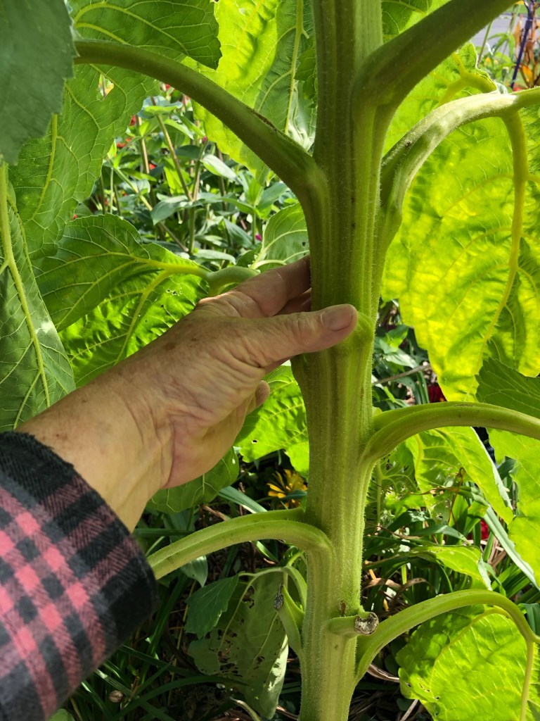 This one stands in a little flowerbed opposite my front door with its handsome face pointing nearly straight up to the sky above. Good thing it has such a thick and sturdy stem, as its head is now heavy with seed.