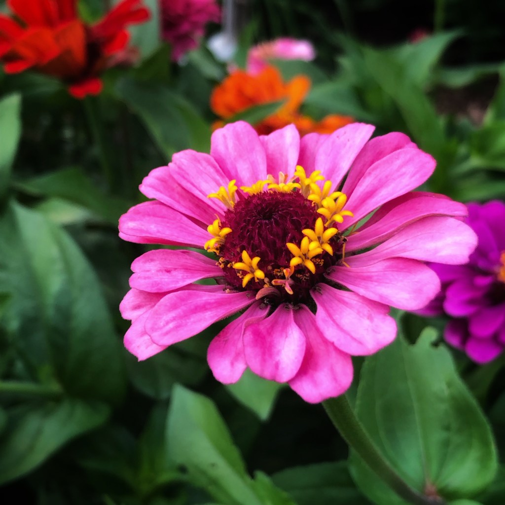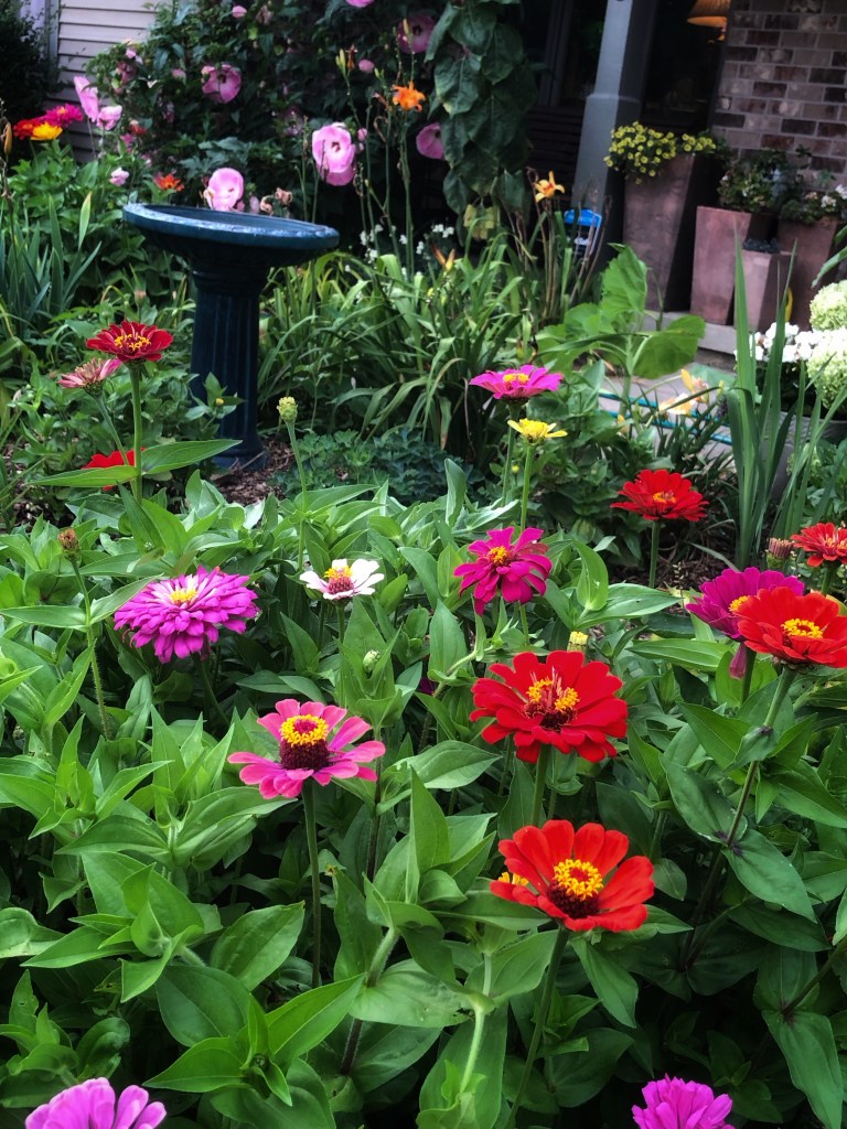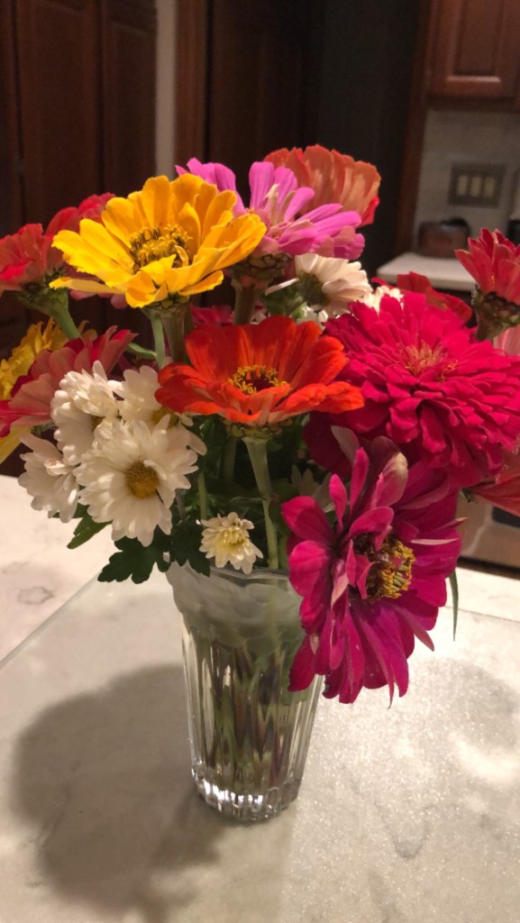 The “heavy on the zinnias” was because I didn’t have the heart to thin the seedlings as much as I should’ve. It turned out to be a happy, riotous mess of color. I may sow some of 2024’s seeds at my workplace so I can more easily pick bouquets for our residents to enjoy.