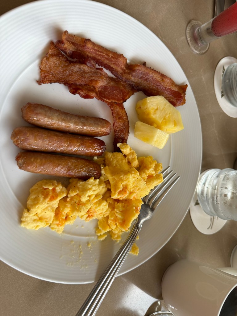 Breakfast at the hotel is included, but I still try not to think about how much the buffet costs when I fill my plate. It’s not going to cost any more or any less if I choose good fuel for my body or indulge in a vast array of sugary pastry. So I choose to focus on what’s in my body’s best interest. Most mornings I have some version of this plate, plus two cups of good coffee. I focus on protein and only eat small amounts of fruit (after all, I’m in Hawaii).