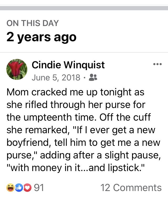 Whether living with me, or living at Beehive Homes of Oregon (WI), momma’s purse was always within reach. Sorting through her purse was a favorite middle of the night activity, so I tried to keep it stocked with all kinds of treasures and little things to sort and discover over and over again.