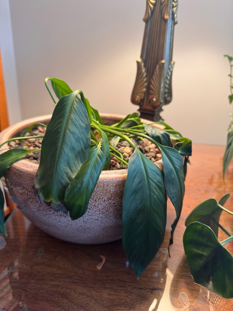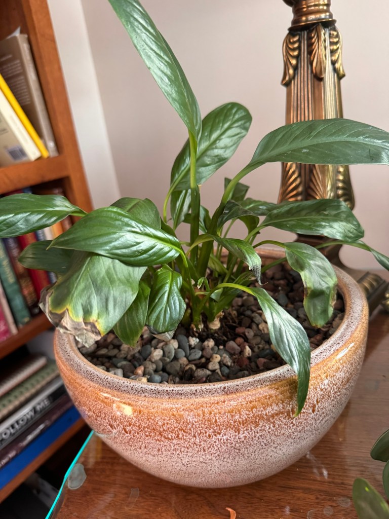 Peace lilies (Spathiphyllum) prefer indirect sunlight, so I keep mine a few feet from an east-facing window. She has bloomed there, indicating she likes the light, but I might not be watering her correctly. I use tap water and let it sit overnight to reach room temperature and lose chlorine, but her leaves have brown tips. This could mean she needs more or less water. I might set a schedule on my phone for regular watering. I’ve also heard that too much fertilizer can cause brown tips, and I use a weak solution of Miracle Grow when watering. Going forward, I plan to use plain water and only apply Miracle Grow every other month.