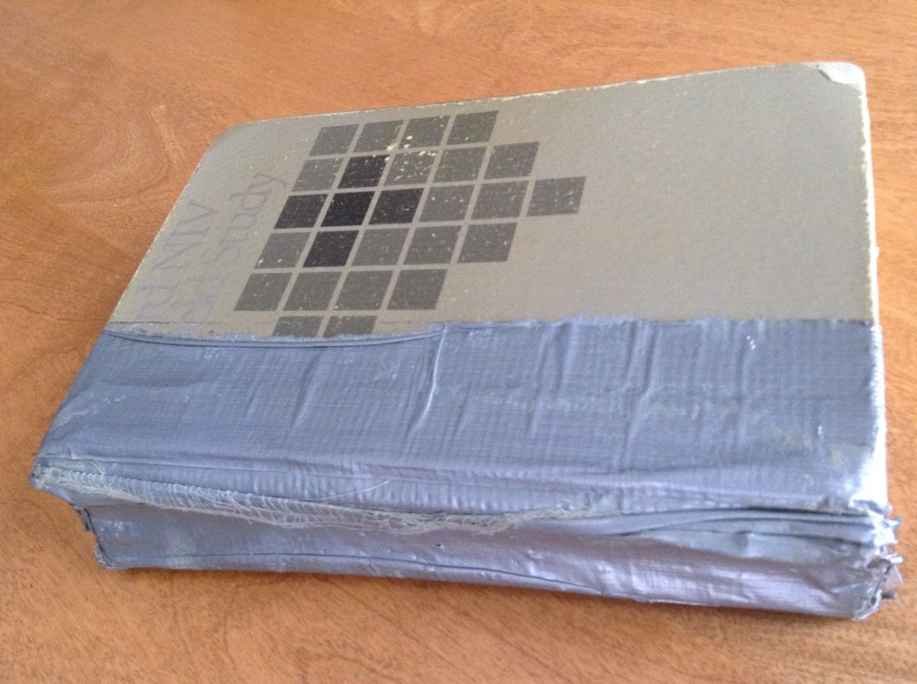 Mom once shared with me that Dad would spend every lunch break at work reading the Bible he kept in his car. He read through it so many times that it fell apart. Dad repaired it with his favorite tool: duct tape. I displayed that Bible at my dad’s memorial service in 2008, but it disappeared sometime during mom’s battle with Alzheimer’s a few years later. I did find another Bible, similarly repaired (pictured).