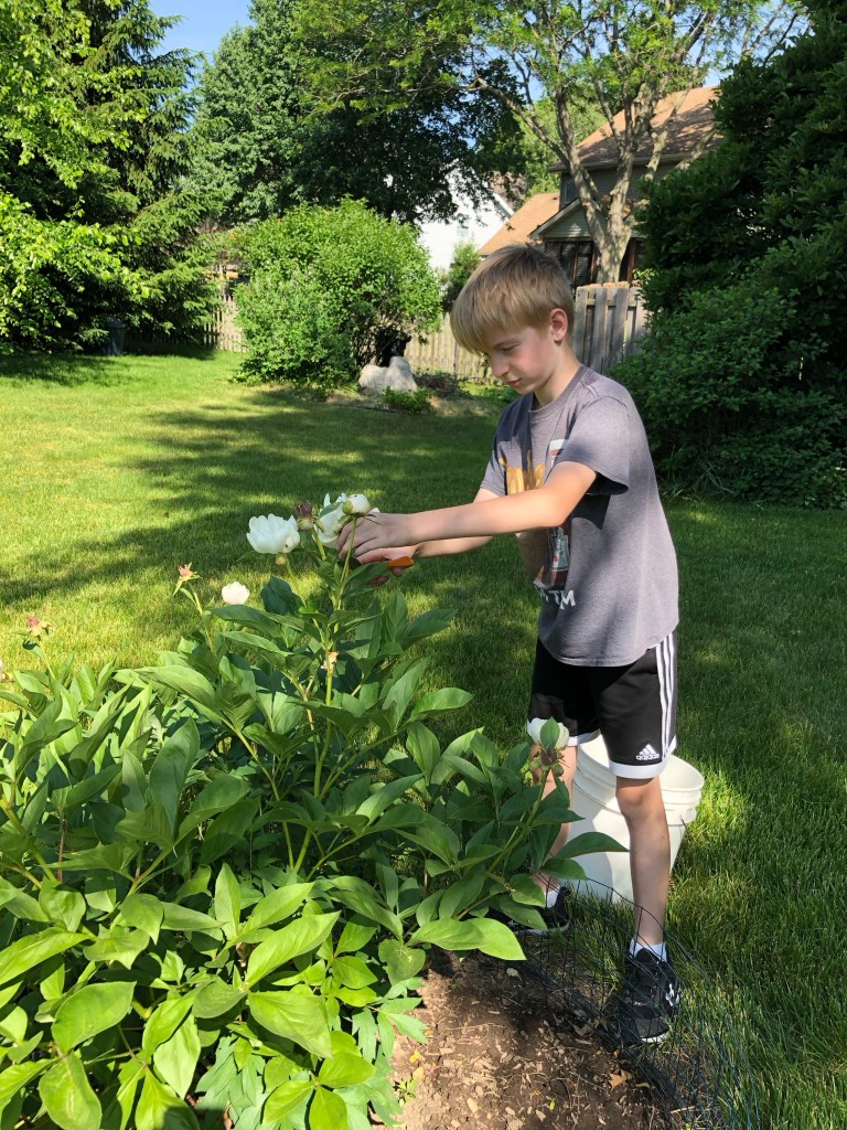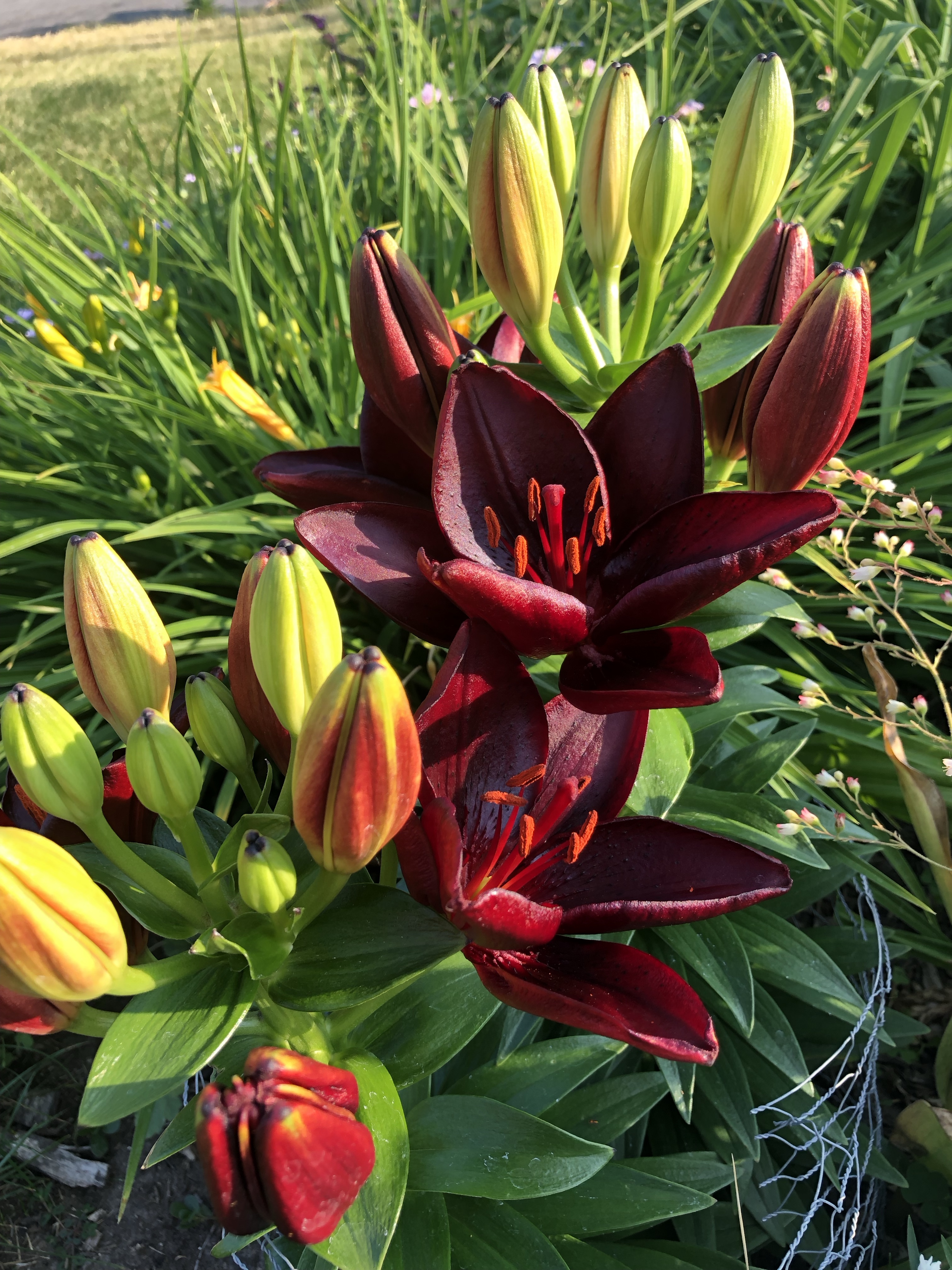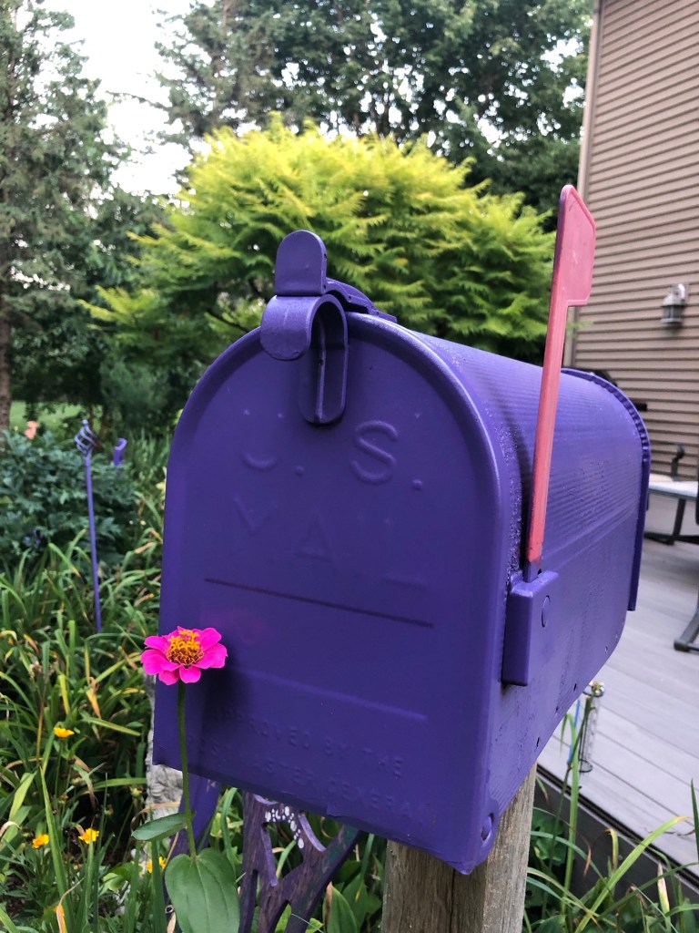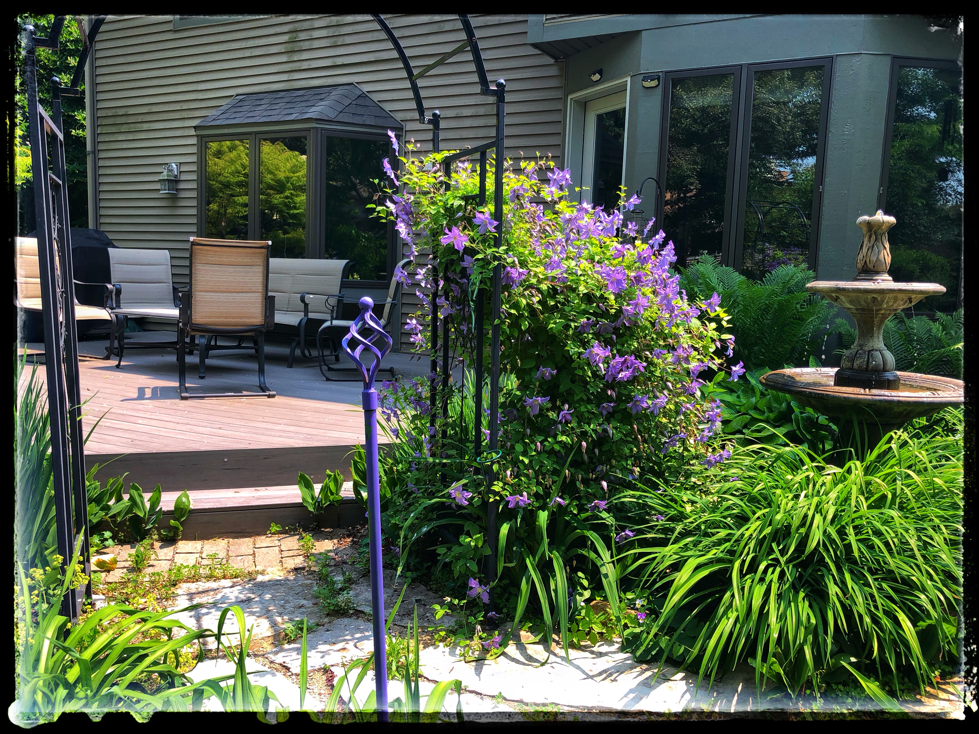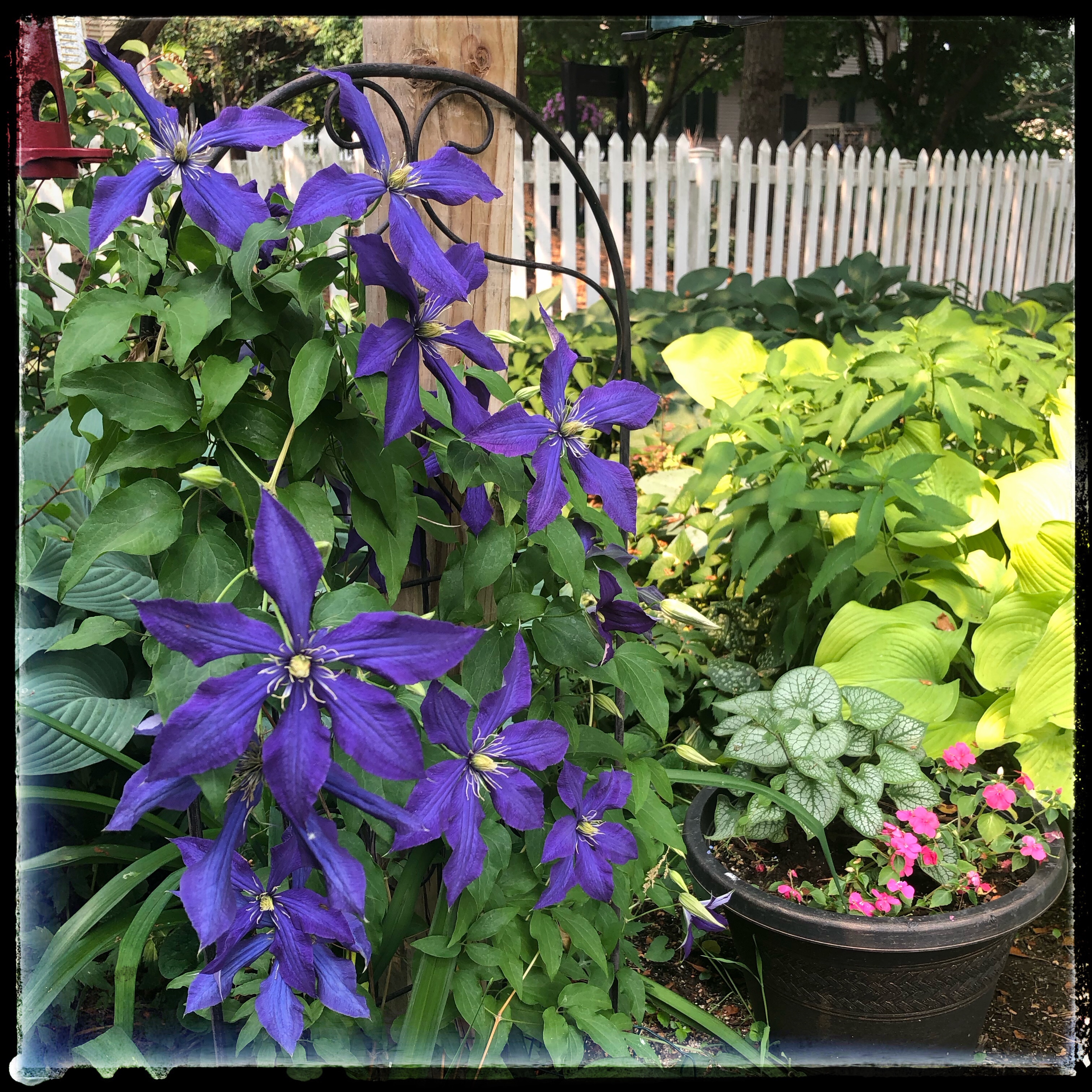 I would describe the color of Clematis ‘Prince Charles’ as lilac-blue. My husband dug this clematis up for me earlier this summer and then rehomed it in a spot about 2 feet away so that it wouldn’t have to reach so far toward this backyard arbor. I call this handsome guy “Charlie” as it is planted to remind me of my oldest grandson, Charlie.