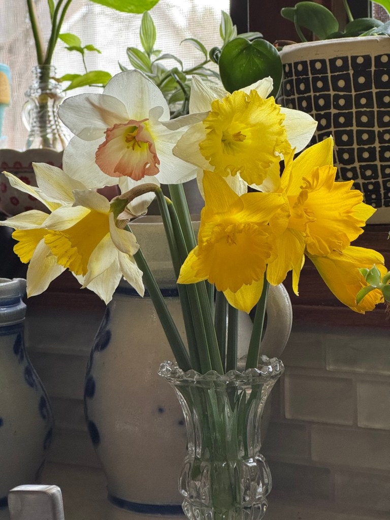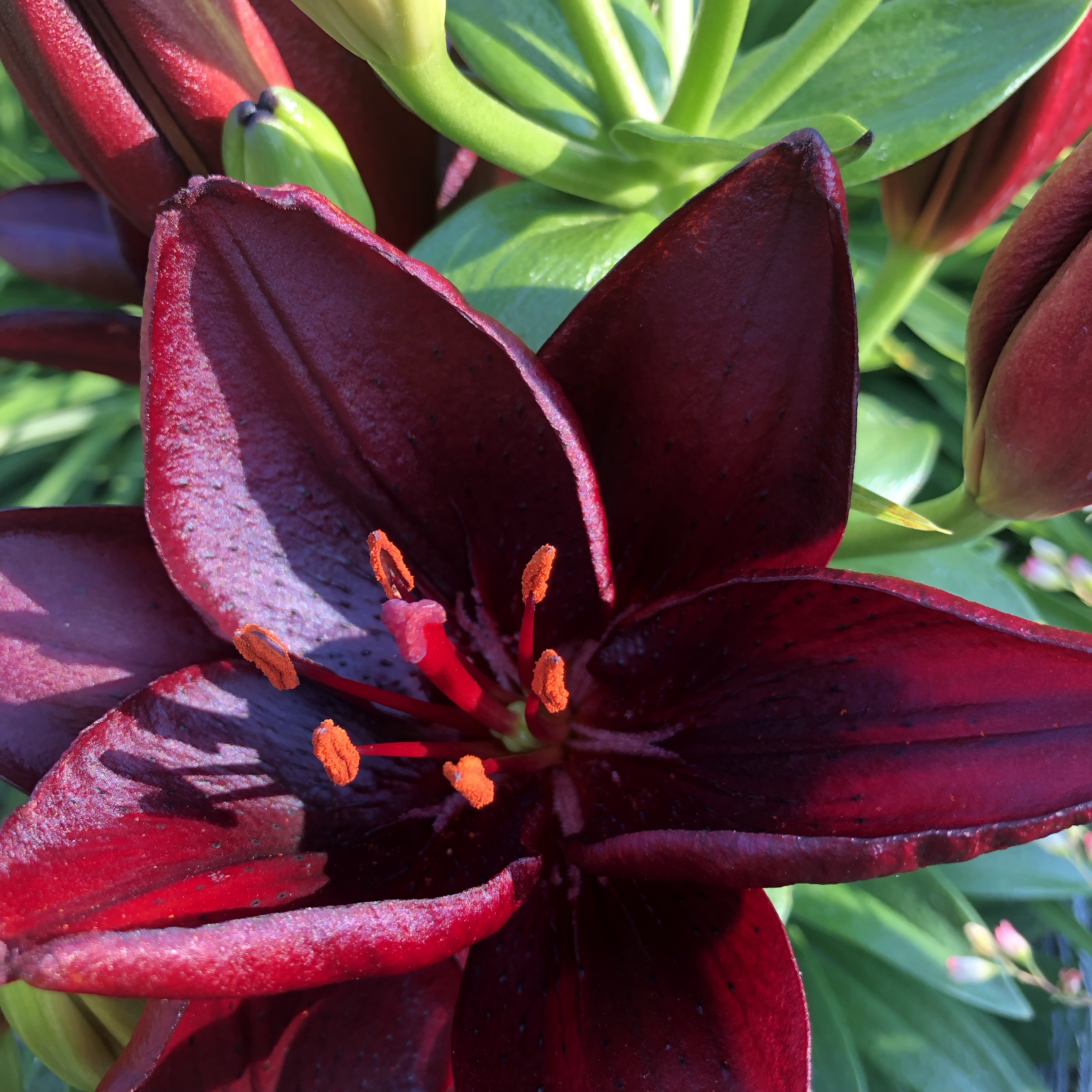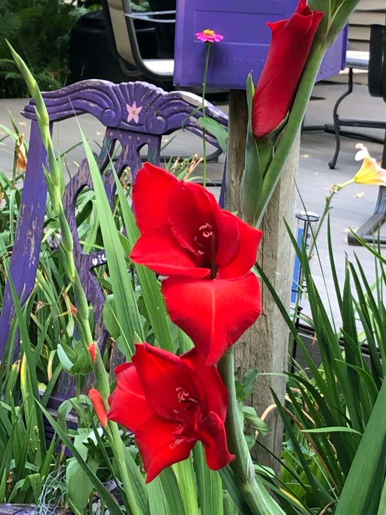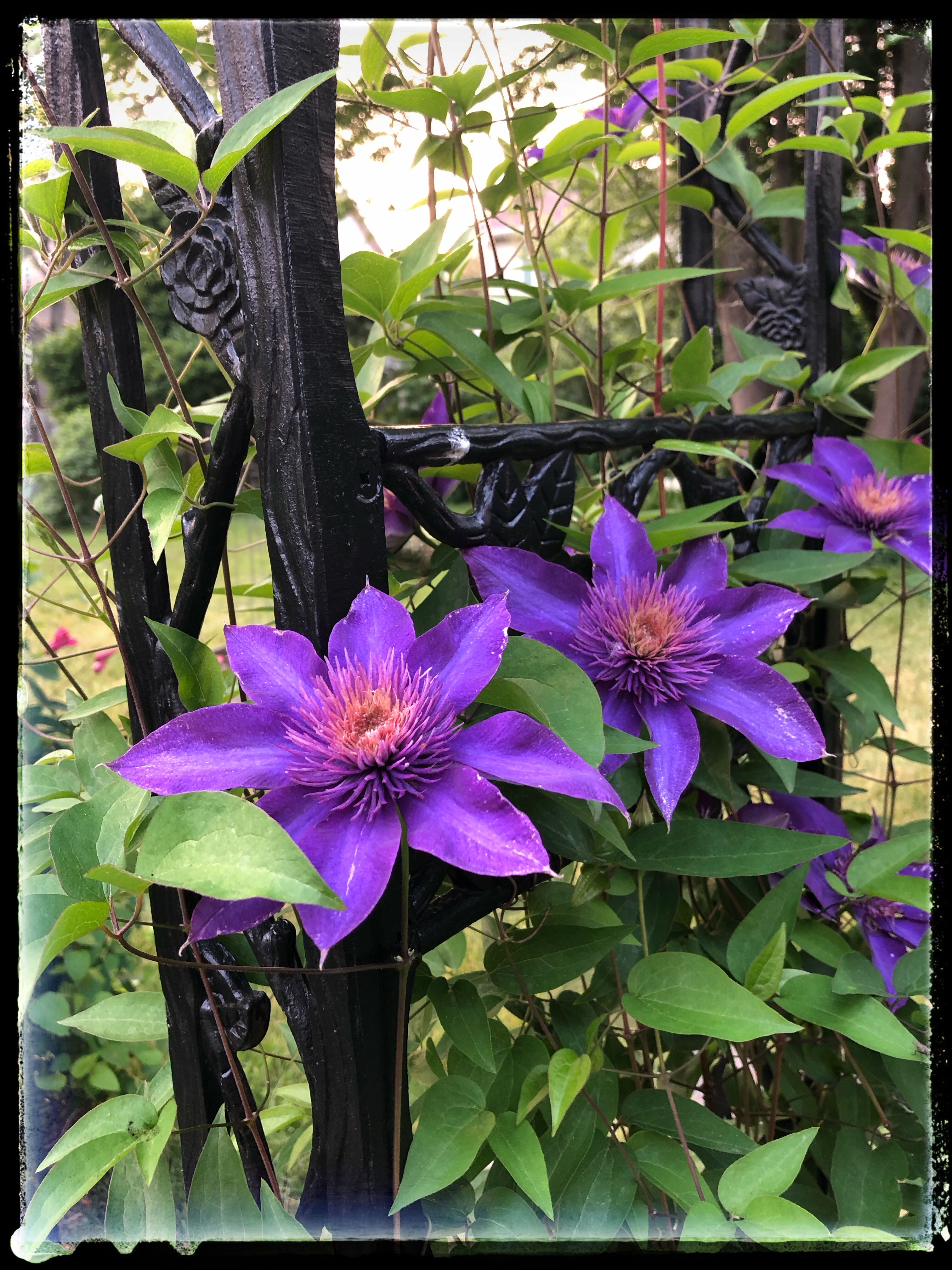 The petals of profusely flowering Clematis ‘Sunset’ are a stunning, velvety purple with streaks of sunset red radiating from her beautiful creamy white anthers. She’s a reliable repeat bloomer, but I’m going in with my pruning shears this week to snip out spent flowers to encourage a stronger repeat bloom.