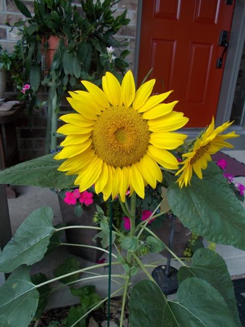 You may find it hard to believe, but I don’t have much in the way of garden space to plant sunflowers. They are heavy-drinkers, so like to be watered a lot. I get rather negligent in that department once mosquitoes begin chasing me around the garden. Consequently, other than the squirrels who steal or scatter seed from our birdfeeders, I rarely plant sunflowers in my garden.