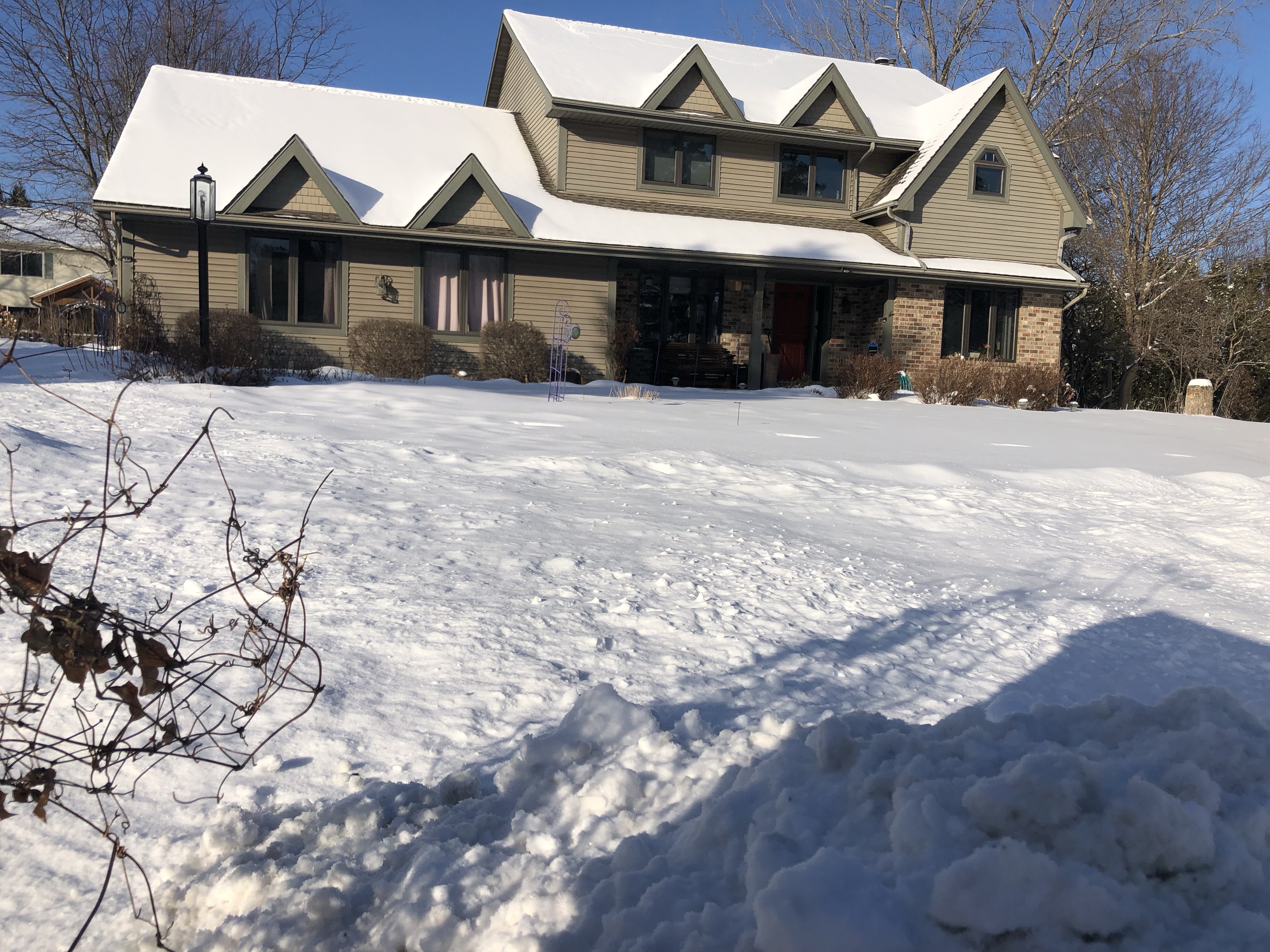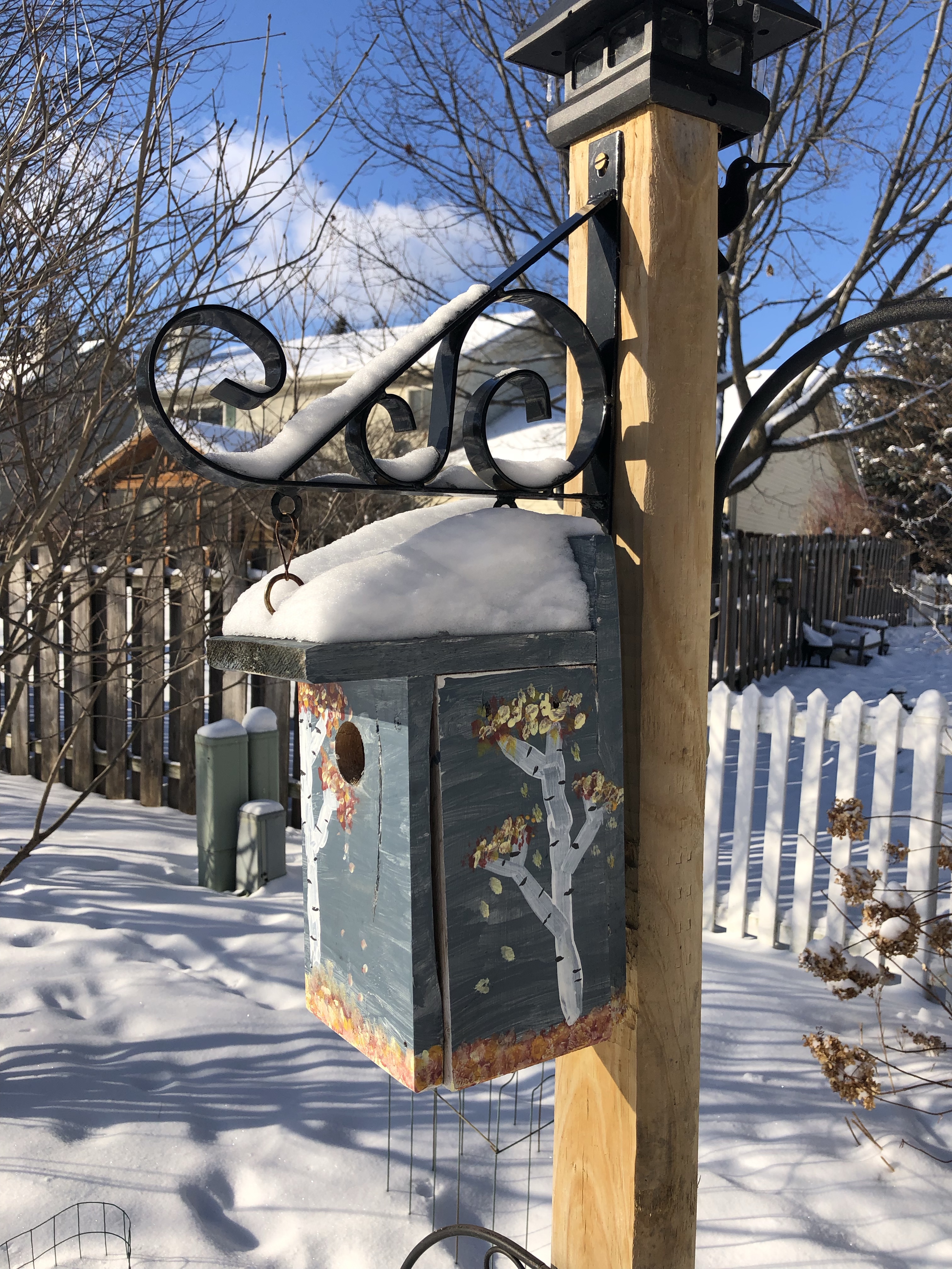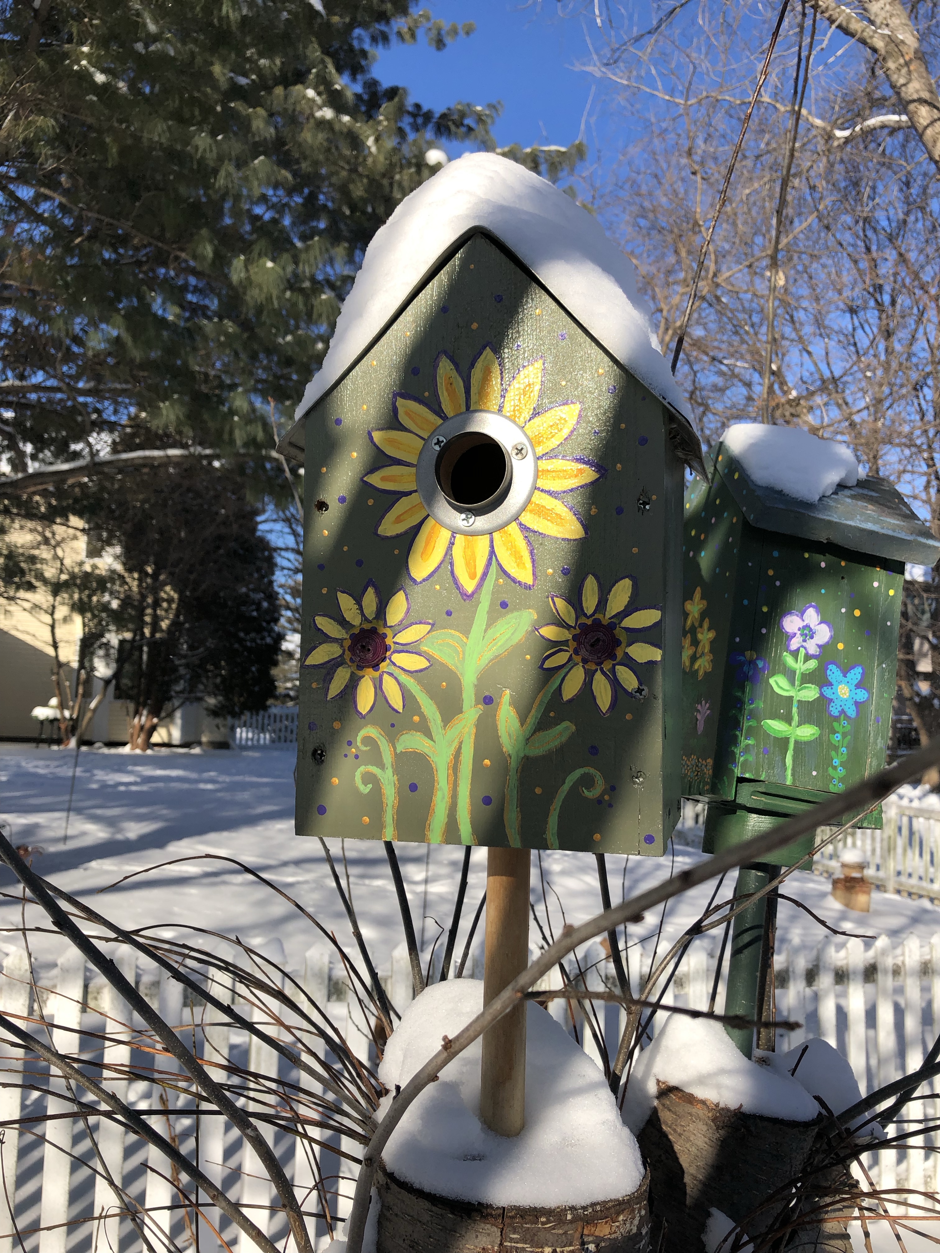 Robins are one of my favorite birds, but they’ve been noticeably absent lately. Although robins sometimes stick around in the winter, my guess is that they’ve quietly moved on to a warmer place. I’ve noticed, too, that the geese are noisily practicing their V-formations as they make ready for their winter migration journey. My hubby and I sometimes think about joining them in their quest for warmer temps, but we choose to stay near family for now. Thankfully, some birds choose to stay for the winter in Wisconsin too. Since they have kindly decided to keep us company and amused during the long, cold months, we decided to return the favor and add some new bird feeders–feeders that the thieving squirrels couldn’t empty in a few hours. We bought three new feeders, all of which have some “squirrel resistance” mentioned on the label. Two of the feeder designs involve surrounding a tube feeder with a cage that only song birds can fit through. The third is a long red tube with slider perches. If a squirrel tries to climb aboard for a snack, its weight will trigger a sliding mechanism that closes off the seed access hole. It took our frequent diners a few hours to decide they liked the new feeders, but they seem to have adjusted well. We haven’t noticed the resident squirrels having success with snitching from the feeders…of course, we also greased the feeder poles to make their initial approach a bit slippery.