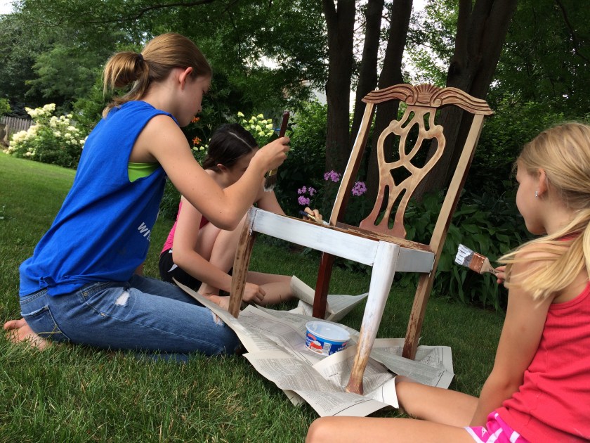 Over the past several summers, my grandgirls have helped me paint discarded chairs to serve as artsy flower rings and decor in my flowerbeds. My friend Anne Marie recently gifted me with two old chairs which once belonged to her grandmother. Yesterday, my granddaughter Noelle spent time helping me prep one of those chairs for painting. We have a color picked out (and it’s not purple this time!), but you’ll have to stay tuned to see what it is.
