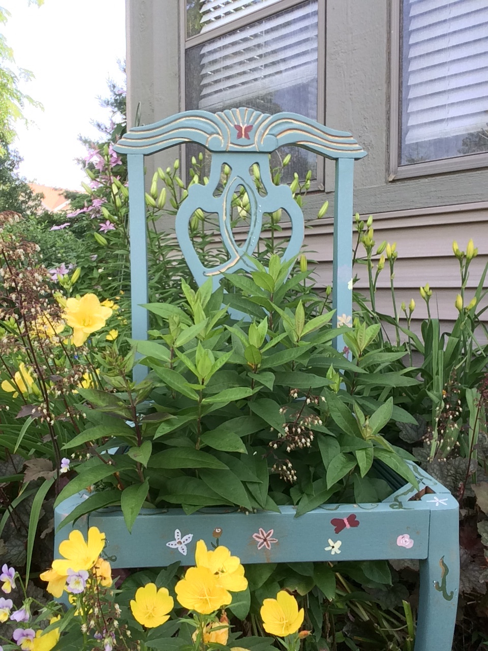 A few summers ago this chair was a roadside treasure that my daughter rescued from someone’s curb. My granddaughters gave it a fresh coat of paint and gave it a few sweet embellishments like this adorable butterfly. This is one of several chairs I have in the garden which serves both as whimsical art and support for lanky flowers.