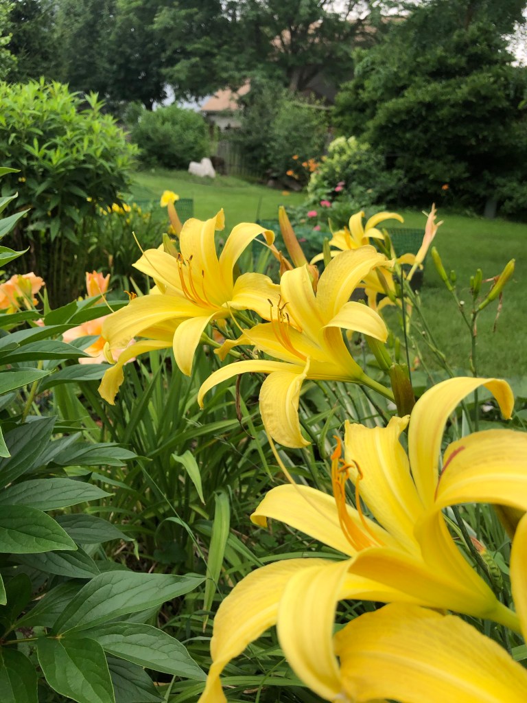 I have a hard time answering the question, “So, what’s your favorite color flower?” It pretty much depends on what is blooming at the time, but I know that I do love to plant splashes of yellow throughout my gardens. I’m really loving this little stand of yellow daylilies happily thriving under the dappled shade provided by our locust tree.