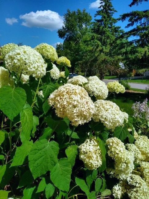 ‘Annabelle’ hydrangea has pretty much taken over one corner of a front flowerbed. It’s kinda floppy at times, but quietly regal, making a lovely foil for surrounding hosta. [Photo credit: Mia Winquist]