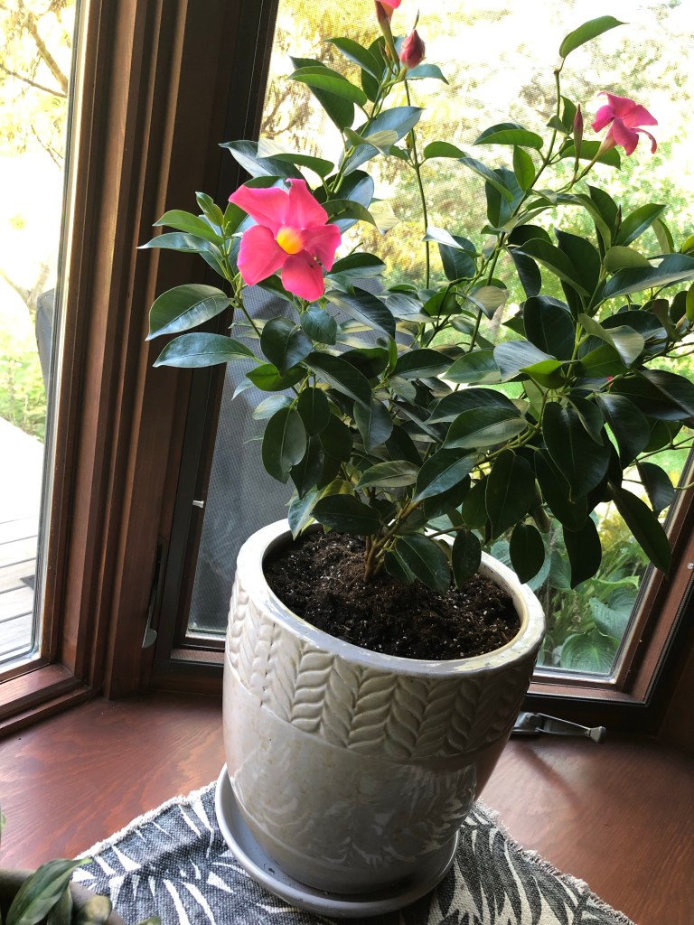 I decided to go ahead and make the effort to overwinter this lovely plant (plus a few others). Hubby took me shopping to find a few new pots for my “bringing the outside in” endeavor. We purchased a roomier ceramic pot in a neutral color for the Mandevilla. I dug the plant out of its summer pot and inspected the roots for signs of disease and pests before replanting it in fresh potting soil in its new pottery abode. I gave the plant a thorough shower in the kitchen sink and then placed it in a bright spot on my family room window seat. According to one of my internet resources, I’m supposed to cut it back a bit, but want to enjoy the blossoms a little bit longer before giving it a haircut.
