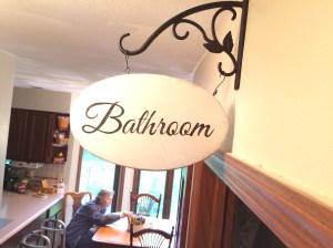 Later on, when we moved Momma in with us, our tiny half-bath became her bathroom. Even though she passed it oodles of times per day in her trek between the bedroom and kitchen, its location still eluded her. We came up with a very helpful solution by placing a sign above the bathroom door which could be read no matter whether she was seated in the kitchen at her usual spot at the table, or seated on the edge of her bed. [I wrote about that sign here.]