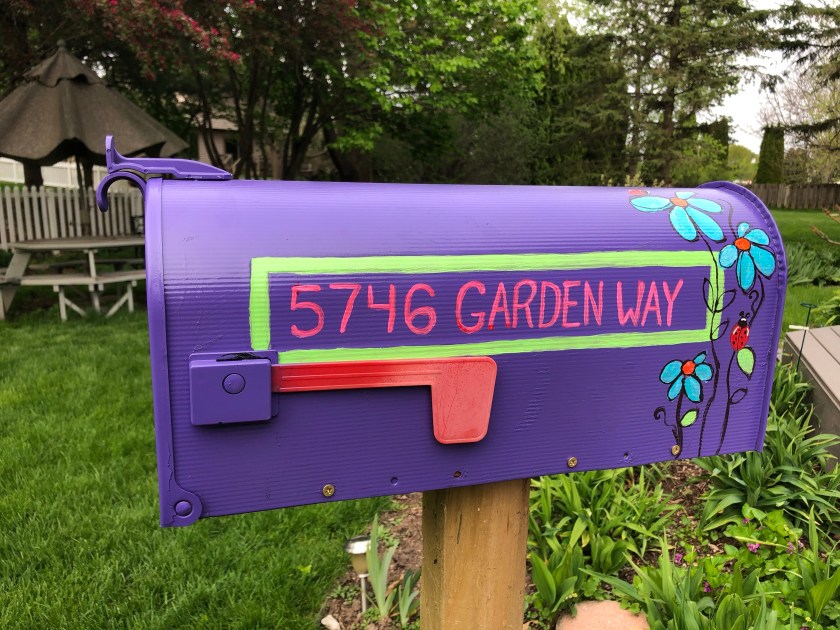 This repurposed mailbox helps me stay focused on gardening tasks in the backyard. With a fresh coat of paint and a just for fun bit of artsy embellishment (it was originally used as a prop for a skit), it houses a few handtools and a pair of gardening gloves. No more running to the garage, then being distracted by something else along my scatter-brained way.