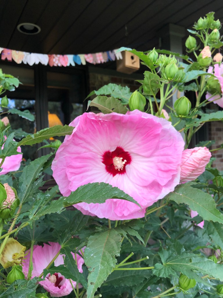 ‘Tie Dye’ Hibiscus (rose mallow) growing by the front door