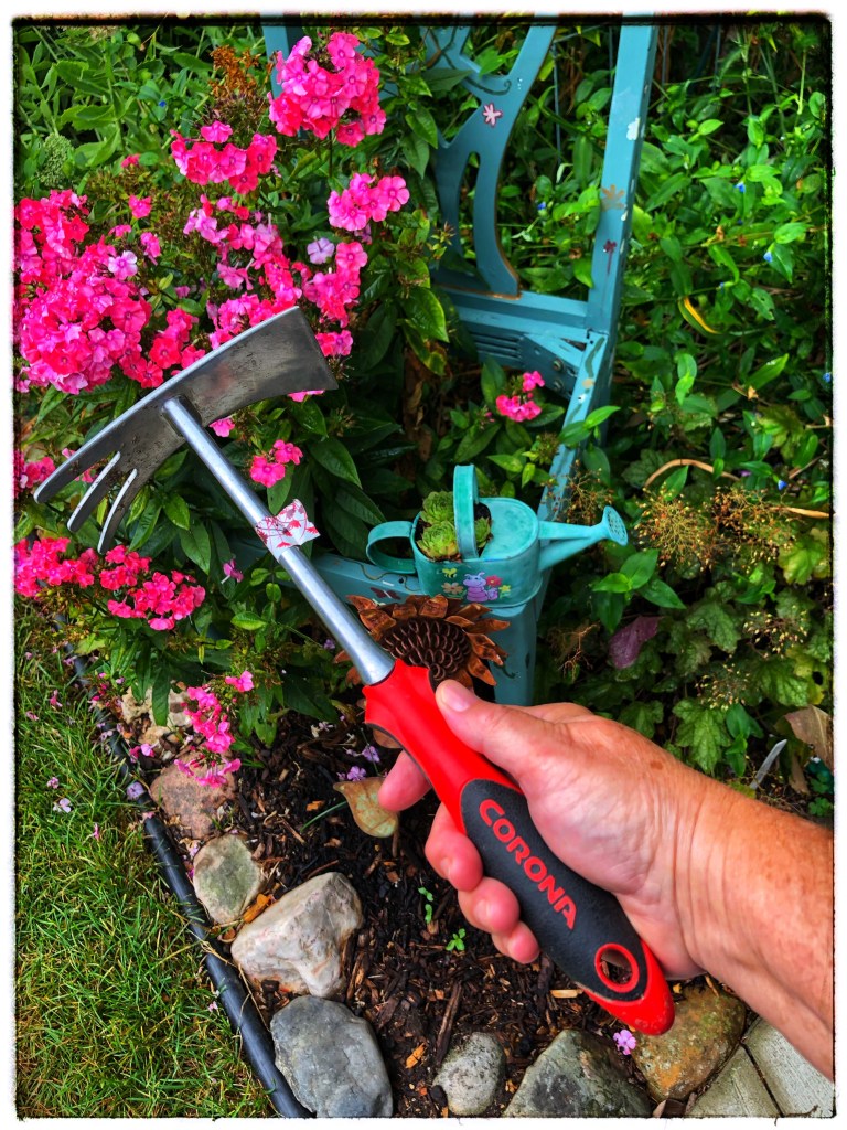 I think I probably use this little “Corona CT3740 eGrip Hoe/Cultivator” nearly every day during gardening season. It’s a great weed cultivator, hole digger, clod-breaker, furrow digger, can’t-do-without gardening hand tool. Hubby ordered it for me from Amazon, where you can purchase it for less than $12.
