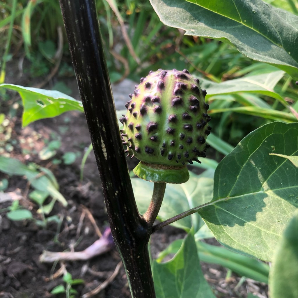 This plant sprouts walnut-sized green balls with knobby purple spikes, each fruit containing hundreds of seeds. Very poisonous seeds, so I’ve read. I have also read that it’s wise to remove the seed pods before maturity because they tend to self-seed and can become invasive…and the seeds can be viable for years to come.