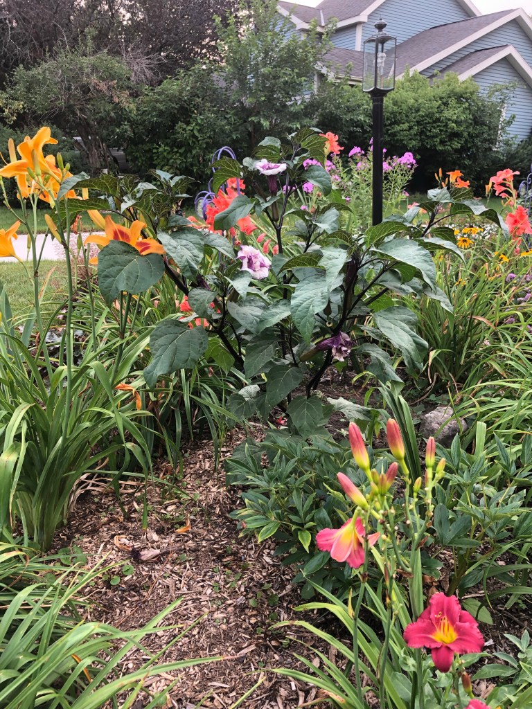 Our two person jury is at an impasse. My husband really likes it. He thinks its cool and wants us to keep it. Me? Well, maybe it’ll grow on me, but I think it’s just ‘kinda meh’ and taking up valuable garden real estate . I’m thinking I’d be happier with another hibiscus strutting its late summer stuff in that spot.