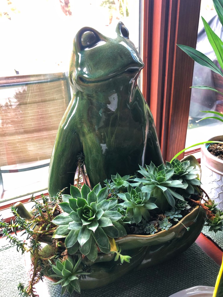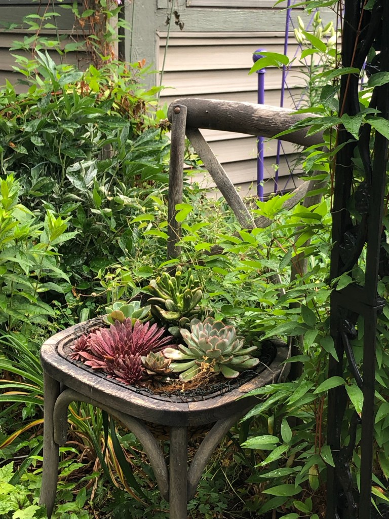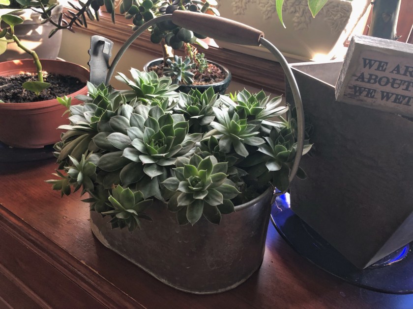 I am amazed by how much the succulent plants in my “chair garden” grew over the summer months. During the first week of October, knowing we could potentially have a frost in the two weeks while we would be away on vacation, I moved the chair into the shelter of our 3-season porch. We’re back from our warm and wonderful vacation in Louisiana, so I’ve been busy moving the plants from the unheated porch into the house so that I can begin the next phase of over-wintering them.