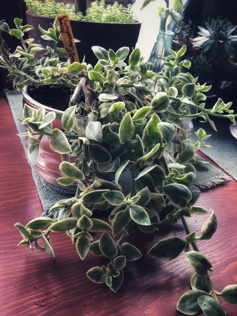 For several seasons now, I have been growing this ‘Livingstone Daisy’ in the pots on my south-facing front porch. There’s so much to love about this nearly care-free plant. It is an over-achiever in the foliage department, putting out beautifully lush, succulent-like foliage. The nicely variegated green and white leaves make this a very desirable plant and teeny-weeny, hot pinky-red blossoms (summer to fall) further embellish this lovely plant. I first acquired this plant when doing some volunteer deadheading of flowers at the assisted living memory care place where I work as a part-time baker. They had several of these vigorous plants which needed a haircut. I composted most of the cuttings, but took a few home to attempt water-rooting. I’m so glad I did.