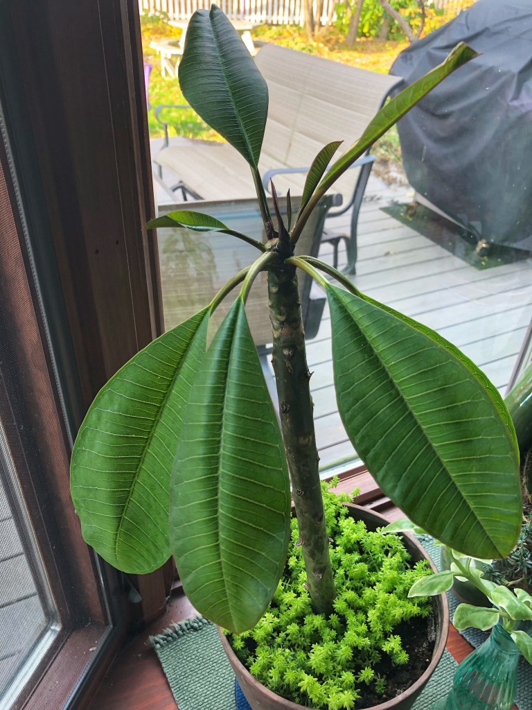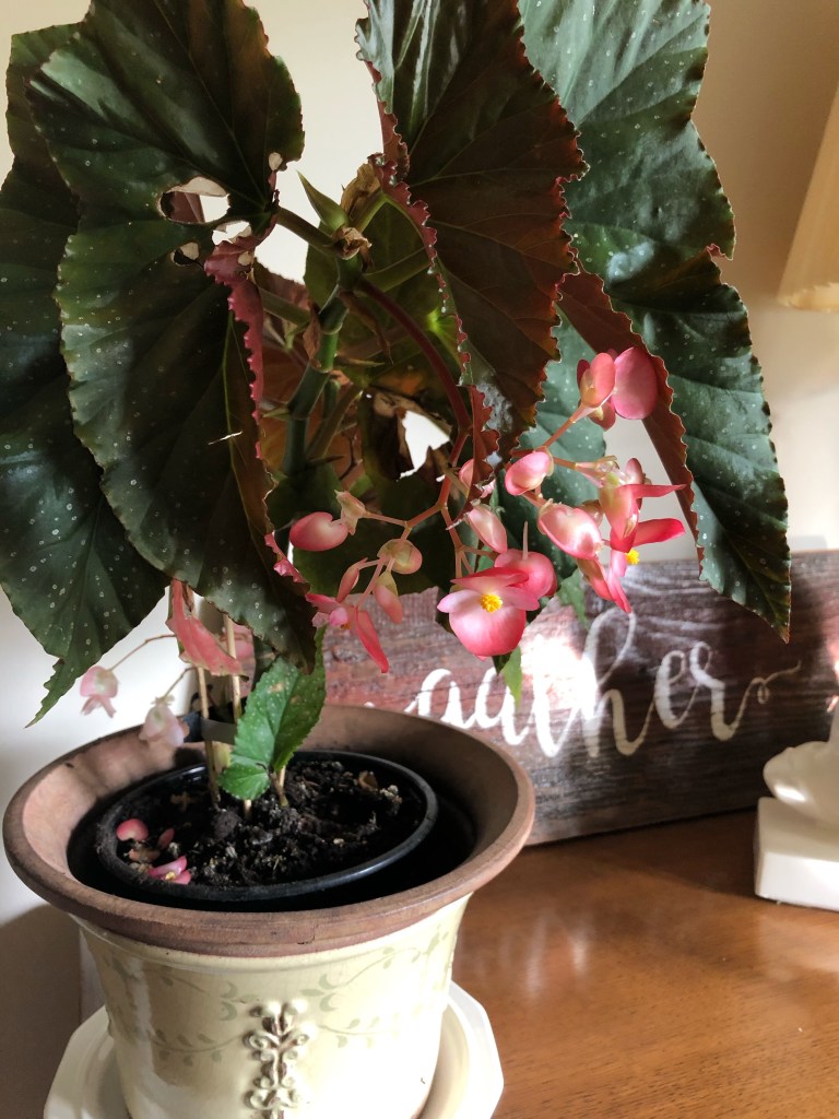 Also coming in from the nippy outdoors were a few of my succulent groupings, a languishing sansevieria plant, and two plants given to me by Melinda, my friend who enjoys playing in the dirt in Louisiana: an ‘Angel Wing Begonia’ (a.k.a. porch begonia) and a plumeria.