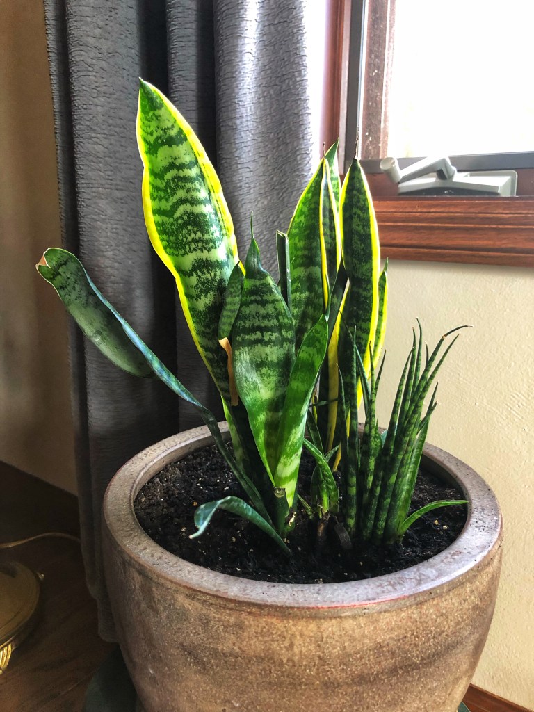 My Sansevieria (a.k.a. ‘mother-in-law’s tongue’ or ‘snake plant’) got a little scorched during some extremely hot weather during its annual foray on the front porch. I dug it out of the pot it’s been in for years, teased the roots apart and salvaged a tiny bit of the original plant. I filled the pot with new potting soil, then added a few different varieties of Sansevieria I purchased at a local nursery to add some interest. It now resides in our ‘Gathering Room’ in a spot nearest an east-facing window, but also benefiting from indirect light from a nearby south-facing window. I am trying not to overwater it, as I am prone to do, and hoping it will reward me with vigorous growth.