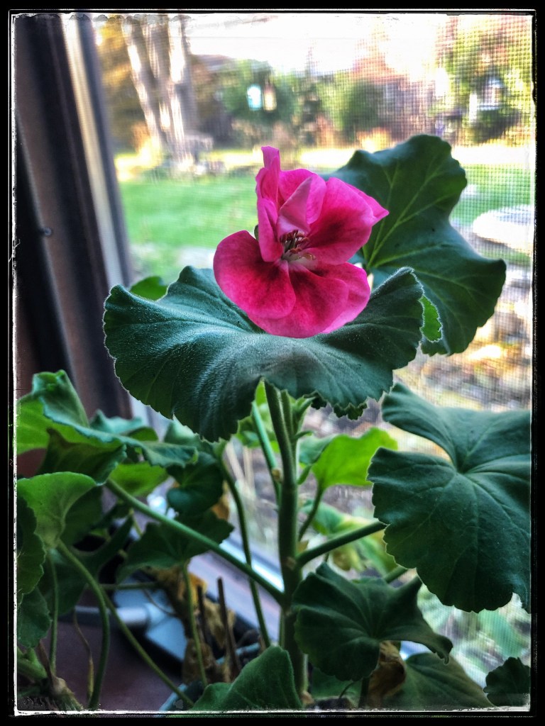 My pelargonium in its winter home, happily rewards my effort with a pink blossom