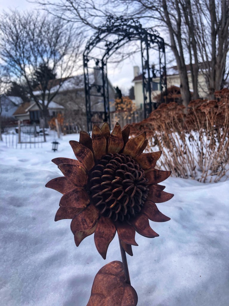 Standing just outside a side entrance to our home is this little metal sunflower sticking out of a little bank of snow. The rusty patina of the artsy sunflower against the similarly colored backdrop of last season’s Sedum ‘Autumn Joy’ lends a bit of rustic beauty and charm.