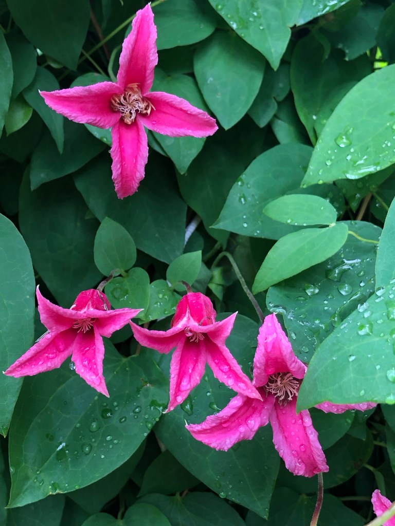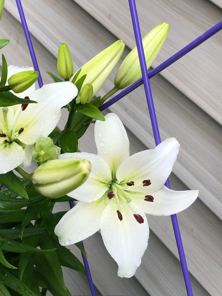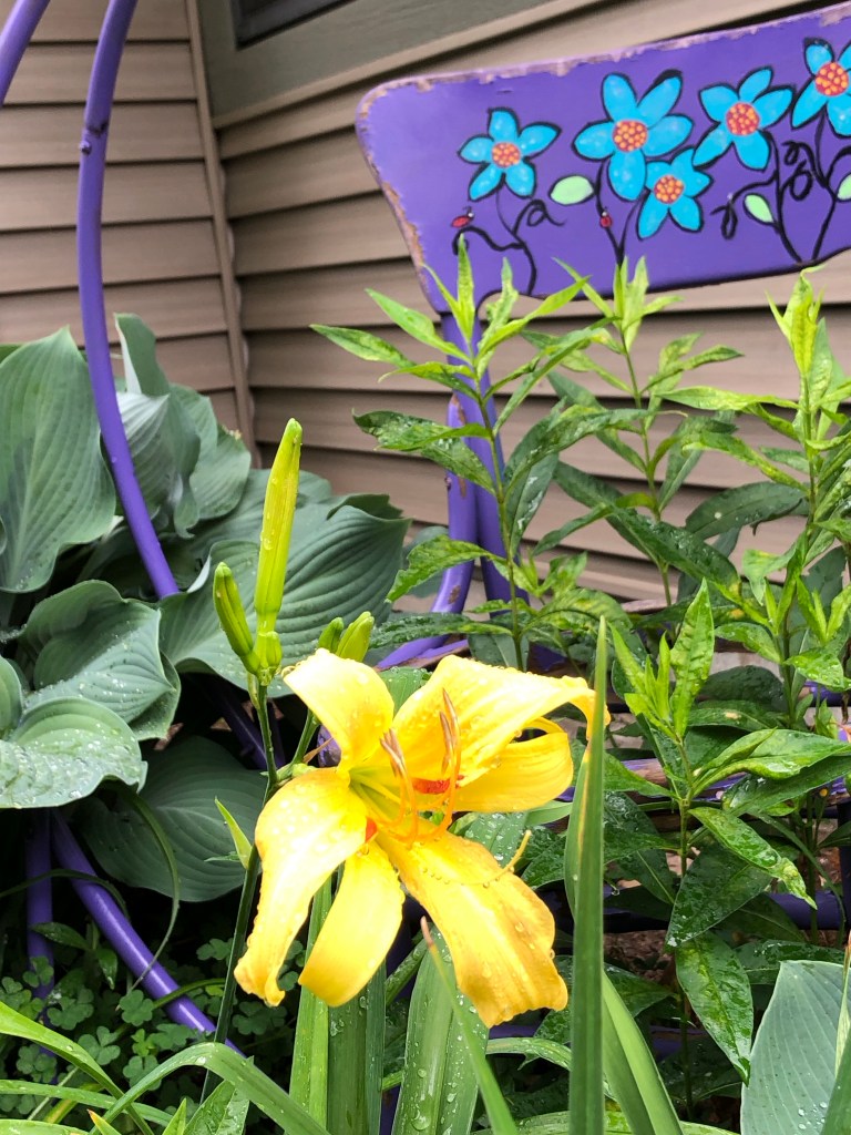 First sunflower to open—a volunteer from 2022’s crop. The succulent chair garden is flourishing!This lacecap hydrangea is from a funeral basket arrangement 15 years ago. A sweet reminder of the love of my cousins and my dad’s legacy of faith. A white Asiatic Lily on the west side of the house. Clematis ‘Princess Diana’ still looking rather regal This & That – an eclectic hodgepodge of plants and purple-y painted miscellany after a refreshing rain. The purple in my garden is my quiet nod to my sweet Momma’s battle with Alzheimer’s. . “And the yellow sunflower in beauty stood.” ~William Cullen Bryant