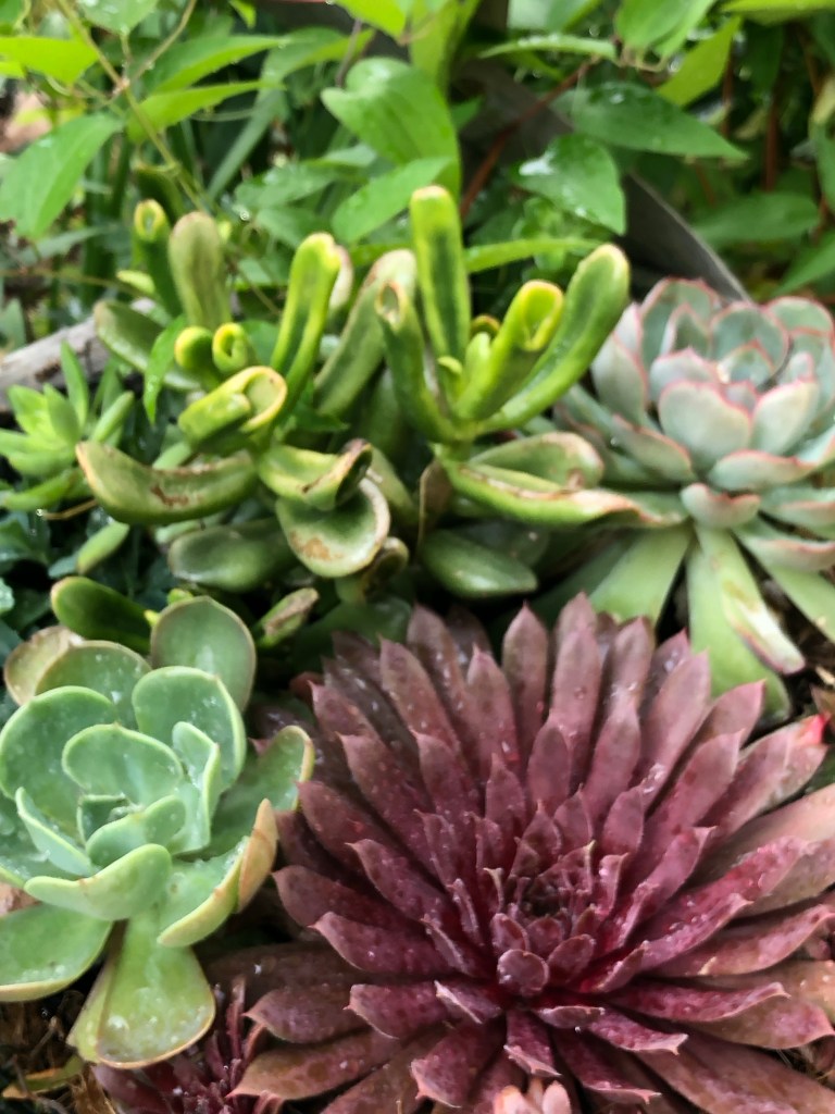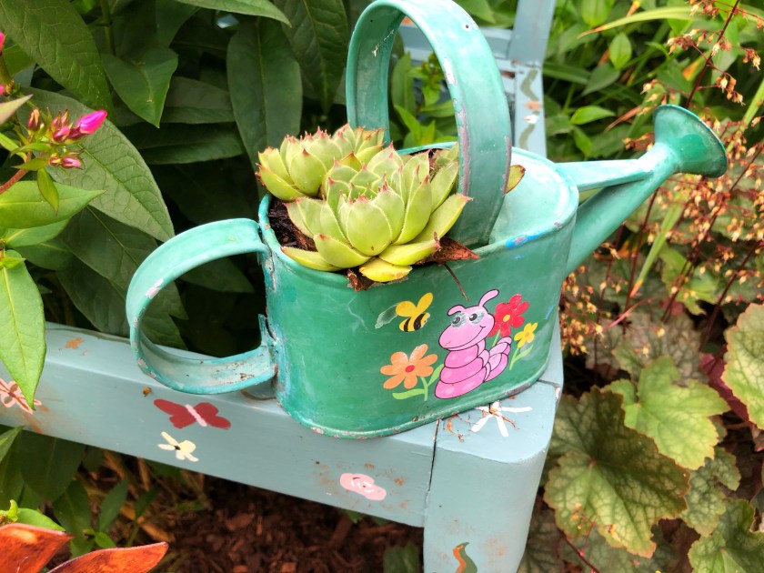 For several years now, this little watering can has held various succulents from my garden. I bought this little watering can around 17 years ago for my first grandbaby. My mind’s eye sees Violet, dressed in her pink ballerina tutu, carrying this pint-sized watering can around and joyfully watering my flowers…and rocks…and me.